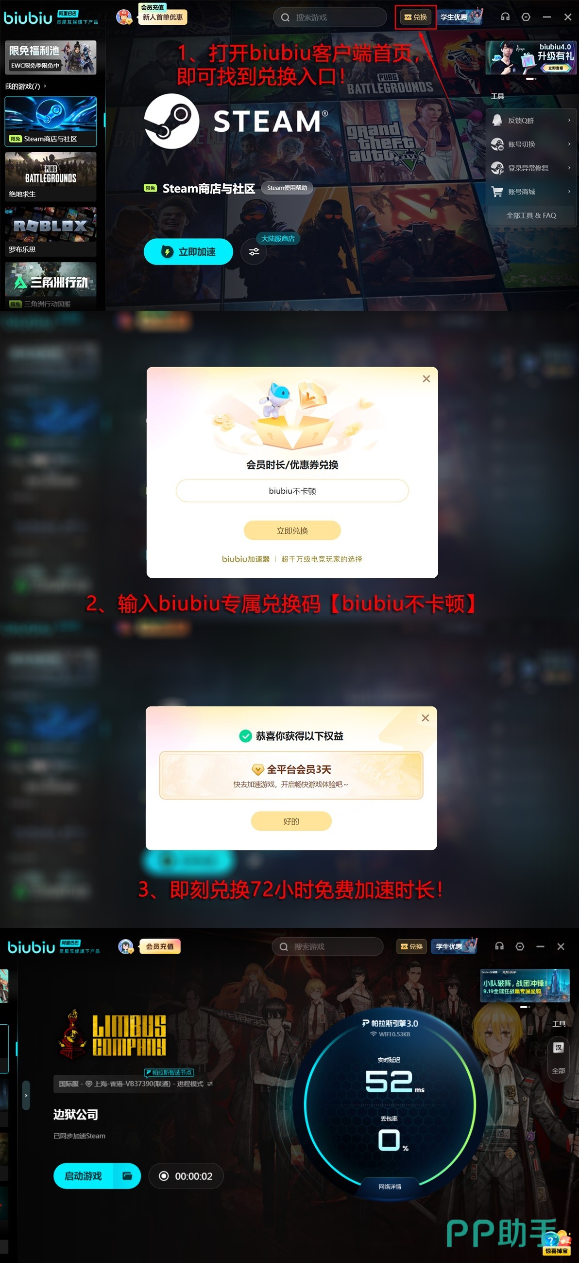 重要提醒!无论新老用户,现在输入兑换码【biubiu不卡顿】,即可领取3天免费加速时长。首次注册还可额外获赠24小时,累计最高可达96小时免费体验。