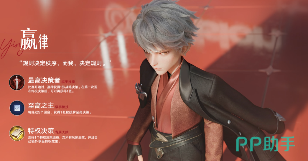 本次终测唯一上线的新角色为嬴律。该角色定位为全局调控型核心棋手,技能体系围绕“阶段化决策”展开,包含【最高决策者】、【至高之主】、【特权决策】三大主动机制。其设计逻辑强调节奏把控与局势预判,区别于传统爆发或续航型角色,更侧重中后期战局走向的主动干预。
