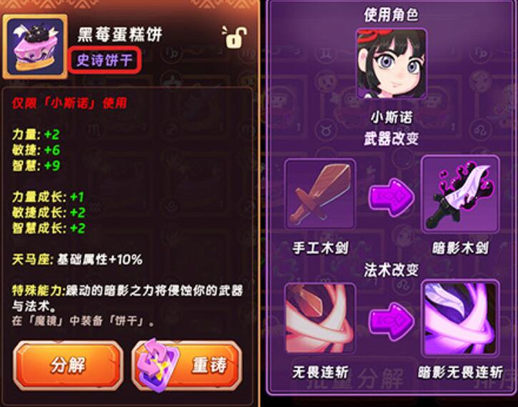 当前版本中共设五档品质等级,涵盖普通至史诗级及以上。不同层级饼干不仅带来递进式属性增益(如+12力量→+48力量),更在史诗级起解锁专属特效——例如猫饼以圆润猫脸造型为视觉标识,黑莓蛋糕饼则强调精致外观与稀有度。基础类饼干主要强化单维属性,而高阶饼干往往附带机制性效果,如暴击率提升、技能冷却缩减或元素抗性加成,需结合阵容需求审慎配置。