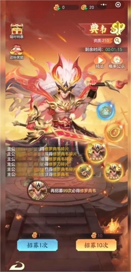 核心合成规则如下:单个完整武将需集齐80枚对应角色碎片;通用碎片支持定向转换为指定武将碎片,该机制为跨角色资源调度的关键路径。碎片主要产出渠道为限定卡池抽取、周期性运营活动及登录奖励,其中限时特惠活动常配套开放SP典韦碎片直赠或折扣兑换,但总成本投入量级显著高于普通武将。