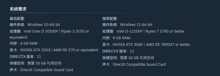 据开发团队公开的技术文档显示,本作对硬件要求处于中等偏上水平:最低运行需搭载Intel Core i3-12100F或同级处理器;系统内存不得低于8GB;显卡须为NVIDIA GeForce RTX 3060及以上型号;安装所需本地存储空间约为16GB,对硬盘容量压力较小。