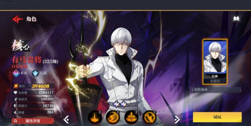 第三位是有马贵将,同样归属不灭阵营,但职能侧重为机动型近战刺客兼功能性干扰者。其位移技能支持快速绕后切入,攻击命中后存在概率将自身负面状态转移至目标,形成类似“反向净化”的战术效果;大招“落雷”具备高倍率群体伤害,且每次命中均可回复一定生命值,配合其被动续航加成,使其在高压战场中拥有远超同阶角色的站场时长;整体设计兼顾爆发、生存与控场三重维度,在多目标混战与Boss战中表现尤为突出。
