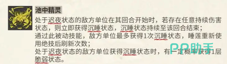 她的另一个被动“池中精灵”更是强化了控场体系:当敌方处于“迟夜”状态且承受持续伤害时,将再次陷入沉睡,并额外附加“脆弱”效果。这种无缝衔接的控制循环,使得敌人难以组织有效反击,为队友争取到充足的输出时间。