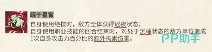 配合“眠于星宵”这一被动机制,在使用绝技时还能使敌方陷入“迟夜”状态,降低其攻击力与速度属性,同时对处于沉睡中的单位追加一次构素伤害。这一设计有效削弱了对手的反击能力,为己方创造了更安全的输出窗口。“静谧平和”则在敌方单位进入沉睡时触发,自动为生命值最低的友方角色恢复生命,显著提升了队伍的持续作战能力。