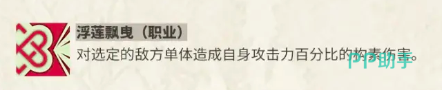 她的基础攻击“逐光”能够稳定地对敌方单位施加构素伤害,为技能循环打下良好开端。而其职业技能“浮莲飘曳”则进一步释放出高额百分比攻击力伤害,使其在辅助之外也具备一定的输出潜力,适应多种战场节奏。