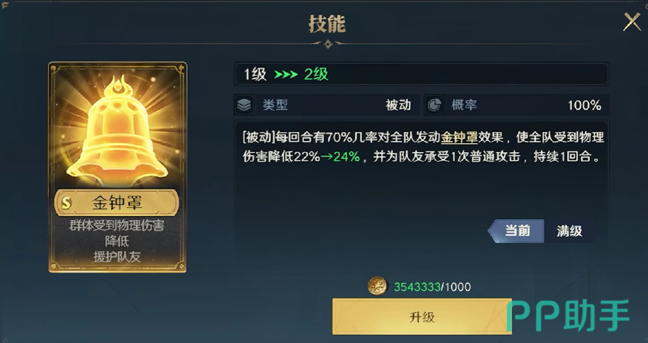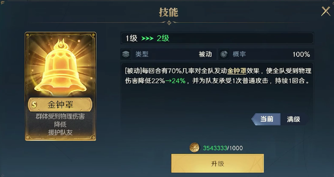 第二个核心技能金钟罩,有70%的概率能够触发团体减伤效果,最高团体减伤效果可以叠加到30,并且它可以为队友承受一次普通伤害的进攻,金钟罩的技能持续时间为一个回合。