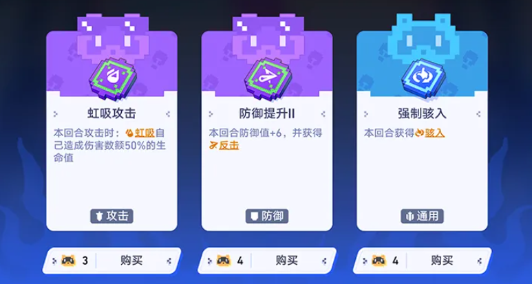 战术点可通过战斗行为积累,用于购置不同品质的战术卡。卡牌按品质分为蓝色与紫色两类,效果与消耗均存在差异。例如,“虹吸攻击”为蓝色卡,消耗3点战术点,可将造成伤害的50%转化为自身生命值;而紫色卡“防御提升”消耗4点战术点,每回合提升6点防御并赋予反击能力。高战术点储备阶段,优先选用高性价比紫色卡更利于局势掌控。