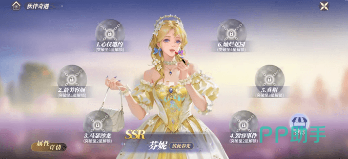 活动期间,芬妮角色本体及专属奇遇卡池同步返场。获取芬妮后,进入伙伴详情页可解锁“衣香丽影礼装”换装功能,并开启专属奇遇副本。在奇遇界面中,从左至右依次点击任务气泡,消耗“万能卡片”即可触发特殊剧情。完成剧情中的战斗环节(胜利即视为通关),即可领取钻石、皇家寻访奖励,并激活对应星级的技能强化效果。