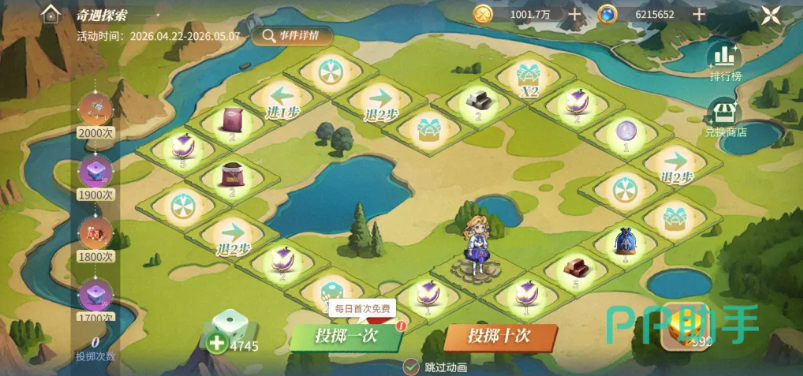 完成主线剧情任务可获得普通骰子与钻石奖励,同时沉浸式体验芬妮的专属故事线。在奇遇探索模式中,玩家使用普通骰子进行投掷,根据点数推动芬妮在棋盘上前进,触发格子内随机事件——如获取道具、开启随机礼盒、额外前进步数等。持续推进还可领取阶段性进度奖励。