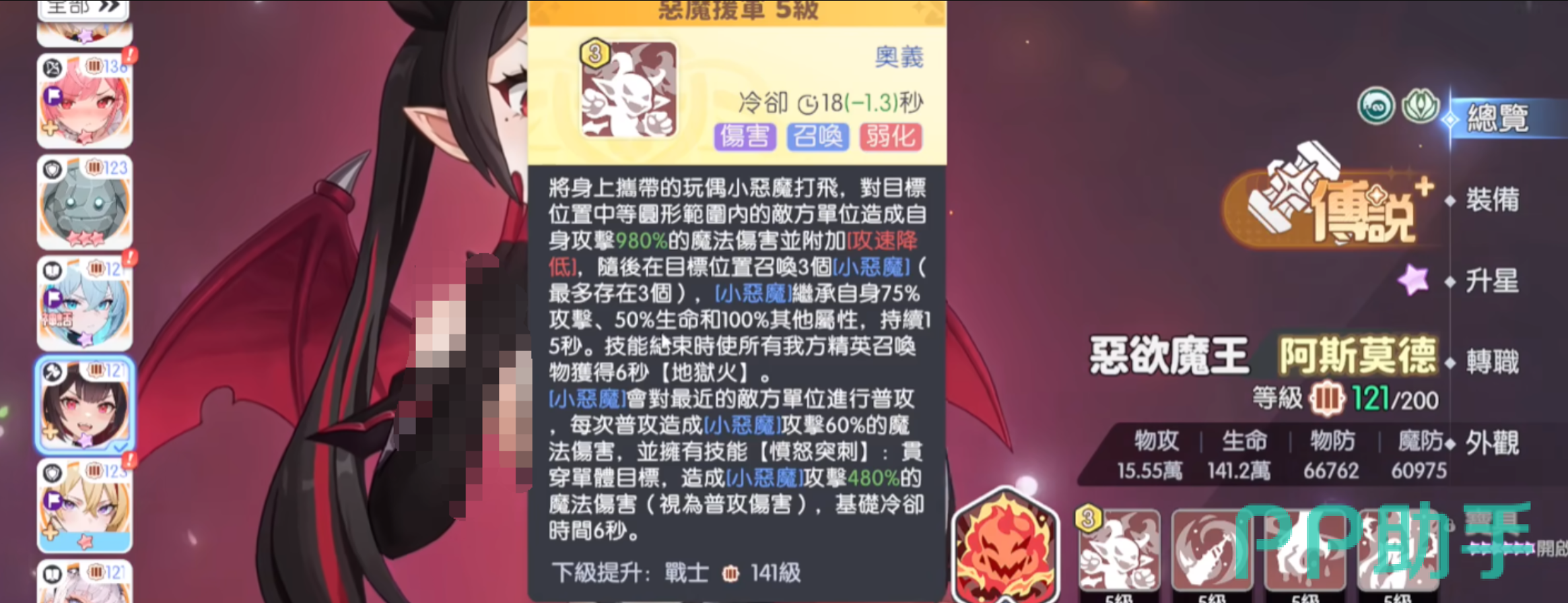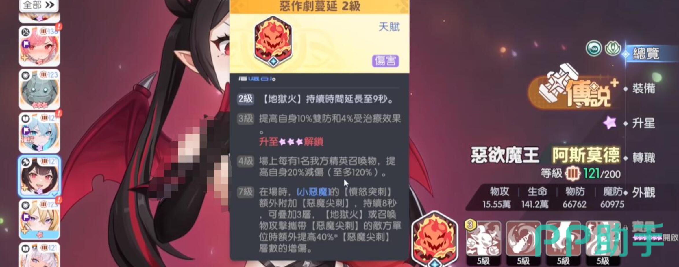 小恶魔与阿斯莫德存在双向技能联动:其登场即自动激活阿斯莫德被动“地狱火”的施加逻辑,使该效果由小恶魔代为执行;同时,其所有攻击与技能的数值成长,均严格跟随阿斯莫德的天赋等级与属性加成动态变化,不存在独立成长线。