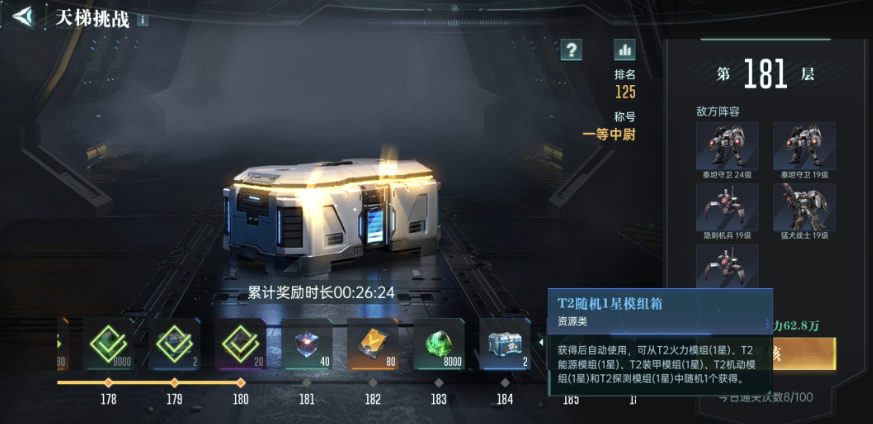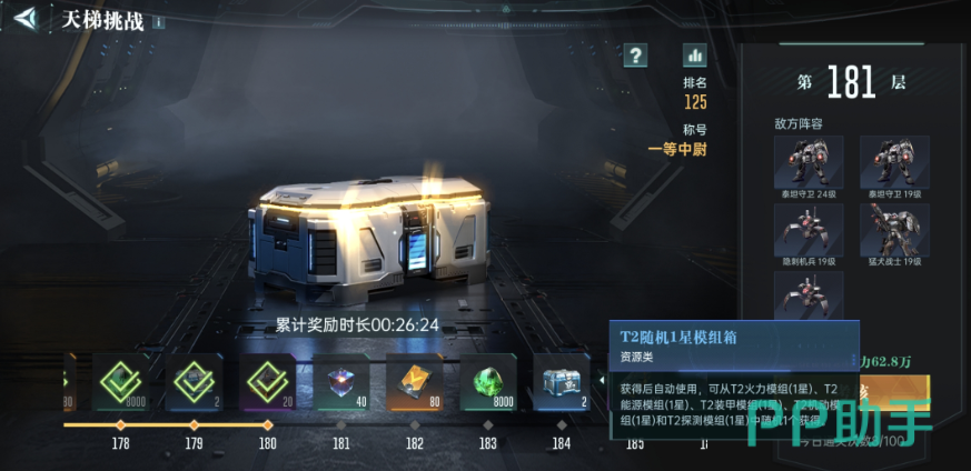 也有部分玩家直接参加天梯挑战,在参加天梯挑战时,玩家要注意每突破5层的天梯就可以获得一个t2的模组箱。由于玩家不断的积累,达到99成以后,每5层奖励两个模组箱,这种方式是长期的,而且是稳定的,建议玩家持续性的挑战就能够积累对应的资源。