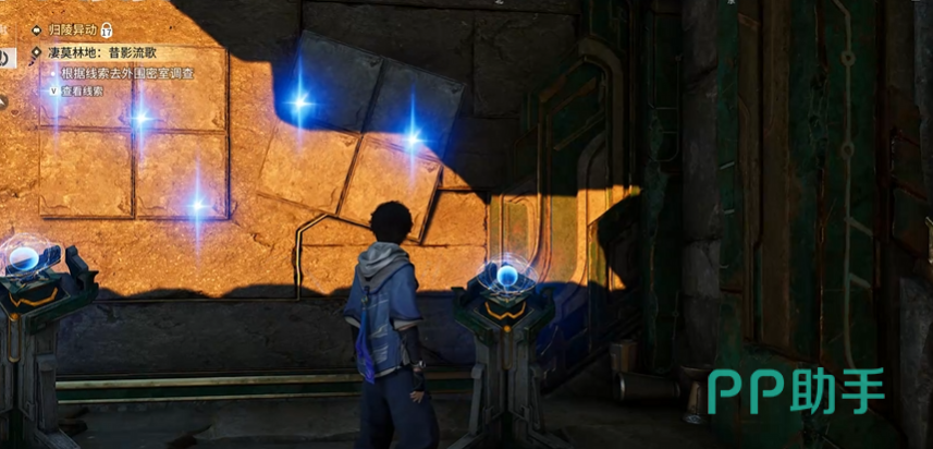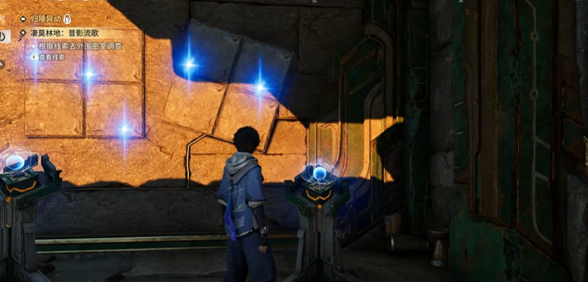 第一枚钥匙碎片位于二层平台。此处需激活黄色机关,使光束经镜面反射。但镜面被藤蔓遮挡,须使用火属性技能或携带火元素角色将其焚毁。清除障碍后启动机关,左侧将浮现黄色踏板。此时需牵引附近石块压住该踏板,以维持机关持续激活状态。