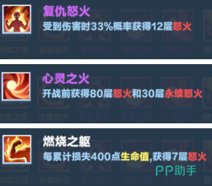 另外这个角色还有一个名叫燃烧之躯的技能,使用之后角色会损失400点的生命之间可以获得7层怒火,另外也可以使用复仇怒火这项技能,角色一旦受到伤害,有33%的概率可以直接获得12层怒火,心灵之火和燃烧之躯也非常适合角色去使用的技能。