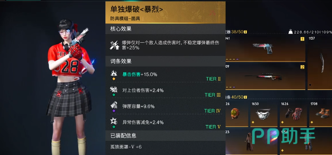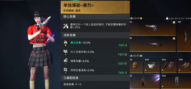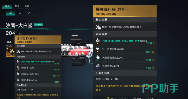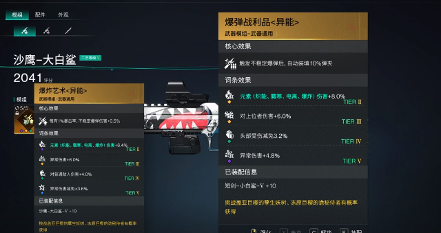 在模组方面武器会有爆炸艺术,还有爆弹战略品两个选择。其中爆炸艺术所造成的伤害比较高,但是就需要经常性的换弹。爆弹战略品实战的体验相对是比较不错的,不过使用之后就需要将弹夹的容量直接叠加到20发。头部的模组应该选择异常专家,大白鲨暴击率足够,而这一个模组就可以带来射击速度以及异常伤害。
