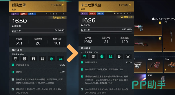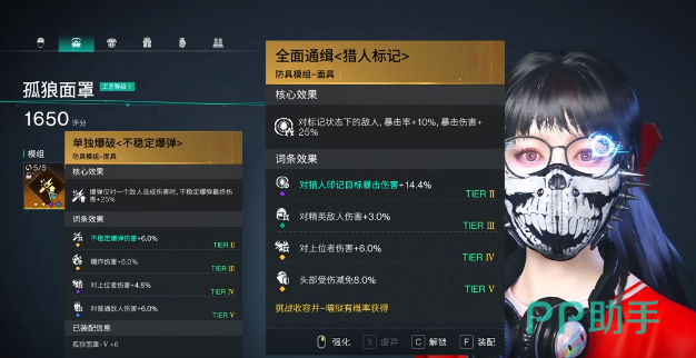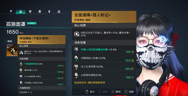 面罩某种方面可以选择全面通缉,也可以选择单独爆破。衣服这一方面可以选择绝境逢生,也可以选择坚盾庇护。裤子可以选择暴击狂热,手套则根据面板的暴击率选择。大于30%可以选择爆伤强化,小于30%选择暴击强化。