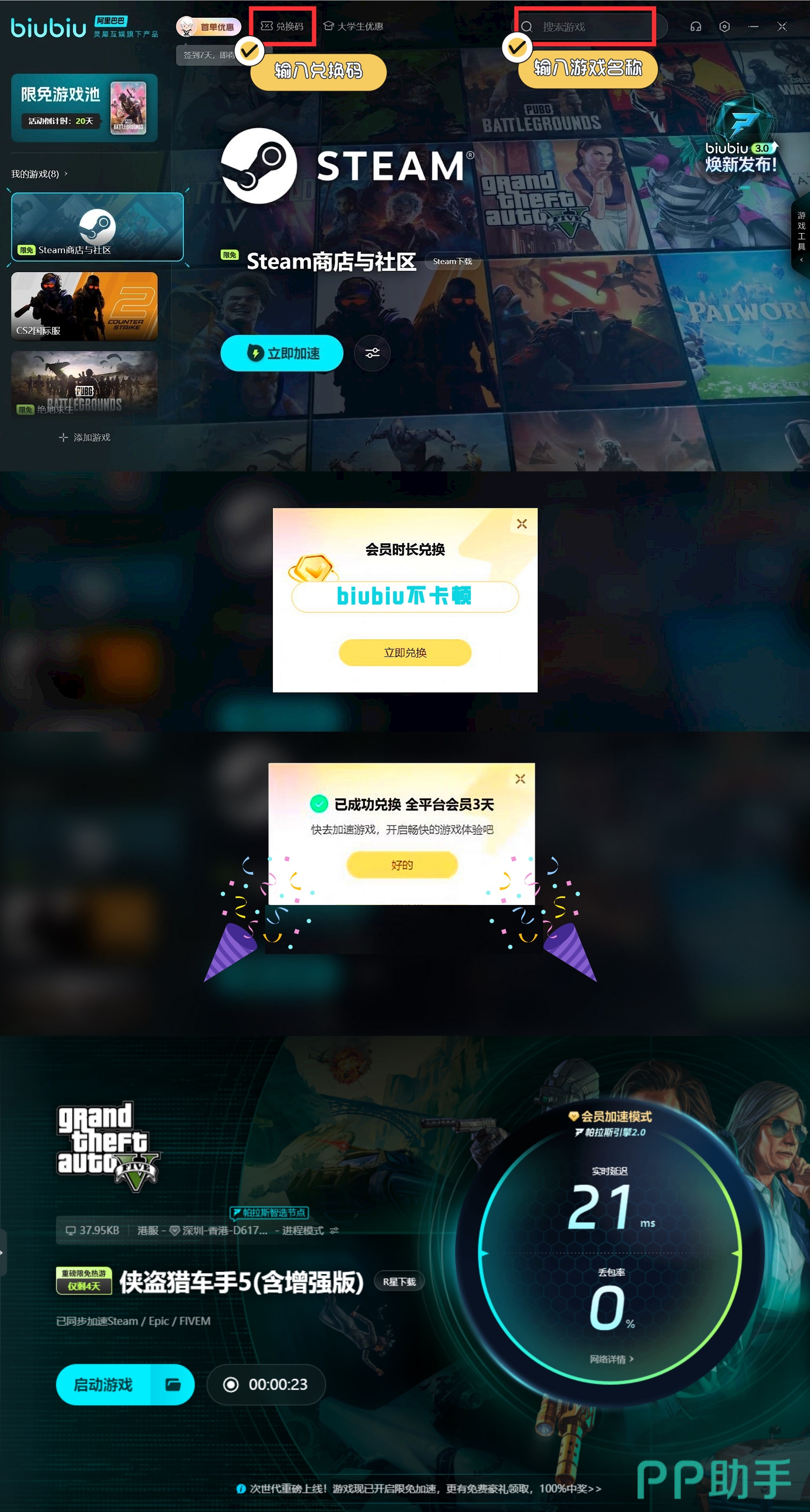 若是各位希望能解锁更多加速机会,还可考虑去点击界面中的兑换按钮,然后输入【biubiu不卡顿】来解锁72h加速时长,如此一来自身的游戏体验效果也会变得更好哦。