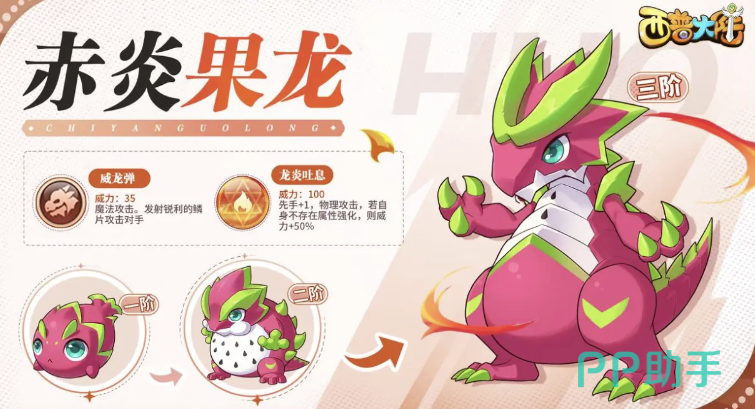 再度进化后会变成赤炎果龙,实力更加强大且最终获得106点攻击,102点物防,114点魔攻,104点魔防的面板属性,尤其是在魔攻属性上的高数值可以说保证后期伤害效果非常出色。性格上可以选择真诚效果,能够再次提升5%的魔攻属性,技能组也会升级为炙热天火、圣炎附体以及龙炎净化,此时进攻时会附带群伤效果,火系技能的附加伤害会非常高而且会逐渐削弱对手的抗性能力。