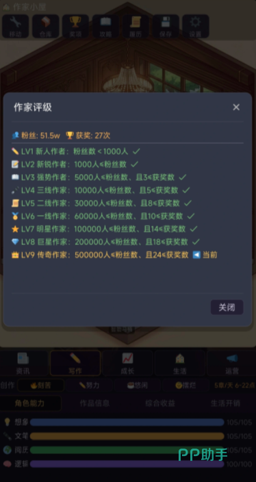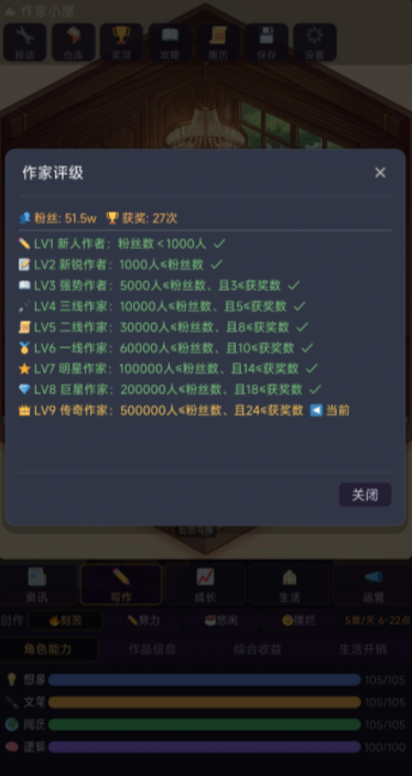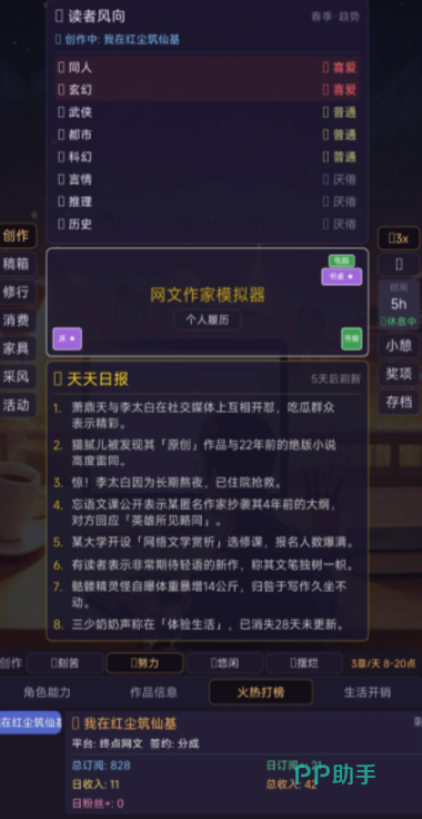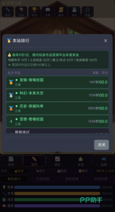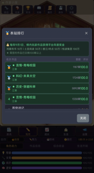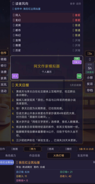 提升行业影响力的关键在于精细化运营:玩家可自定义书籍副标题、优化封面关键词、投放定向推广资源,并积极参与游戏内设立的“年度新锐奖”“人气连载榜”“最佳世界观设计奖”等周期性评选活动。获奖作品将获得首页推荐位、流量加权及专属成就标识,显著增强曝光转化率。游戏采用拟真24小时制,作息安排直接影响健康值与次日初始体力,科学规划写作节奏是长期发展的核心能力之一。所有文字内容均由系统智能生成,玩家只需选定类型、设定核心要素,即可见证作品随时间推移自动成稿。