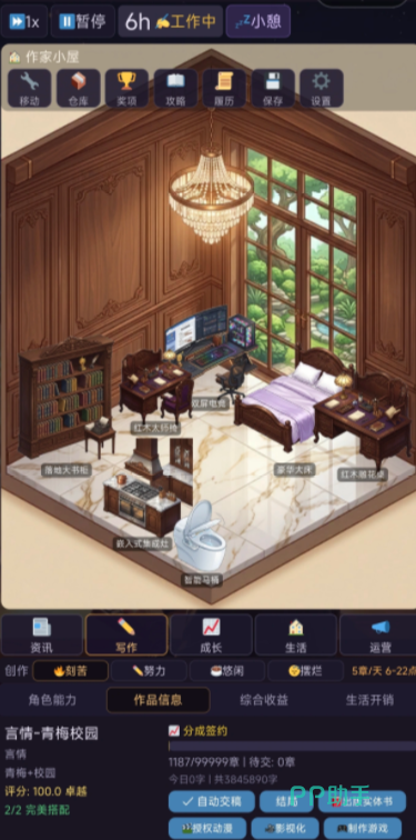 游戏开局以“小屋搭建”为切入点,玩家需在专属写作空间中自由布置桌椅、书架、台灯、绿植等百余种家具组件,打造个性化创作环境。该空间不仅是视觉呈现,更与角色状态挂钩——合理布局可小幅提升专注力与灵感值。进入写作阶段后,系统会动态生成读者偏好趋势,涵盖玄幻、言情、都市、科幻、轻小说等主流网文分类;玩家需根据实时风向调整选题策略,已启动但未完结的作品支持存档功能,待市场热度回升后再续写发布,降低试错成本。