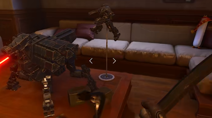 茶几上陈列着南十字机甲模型,旁边的留声机可播放逆战端游大厅的经典背景音乐,瞬间唤醒老玩家的记忆。房间内设有三个问号标记,互动后可获得猎场金币奖励。此外,饮料机支持敲击操作,多次击打有机会掉落金币。墙边的游戏机屏幕上显示的是端游大都会的地图画面,角色手持武器为“灭烬之嗣”,正是原作中的一把免费初始装备。