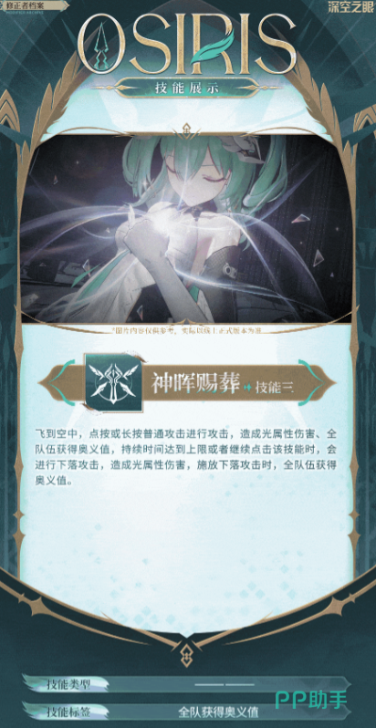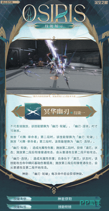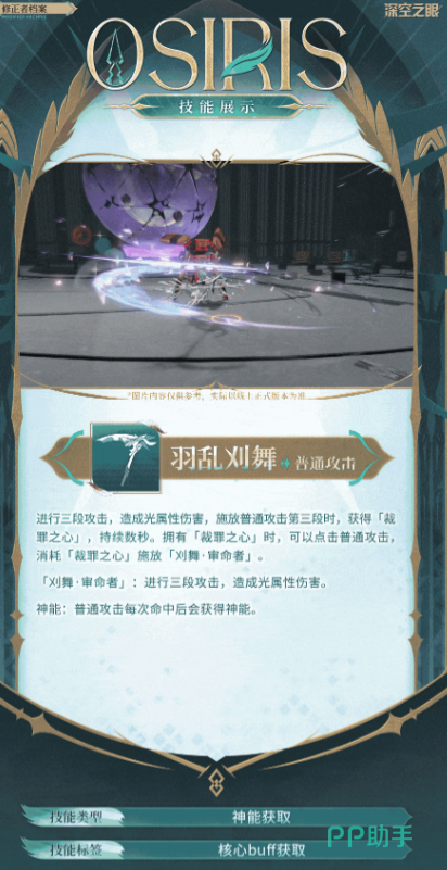 奥西里斯的技能总共有三类,第一个技能是普通攻击技能,她可以向前方释放出三段攻击,每一段攻击都属于光属性伤害,在第三段时,奥西里斯会释放一次“裁罪之心”,裁罪之心持续阶段,点击普通攻击技能,可以打出特殊技“沉鸣”,造成连续的三段光属性伤害。