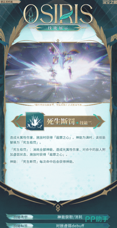 奥西里斯的奥义技能,可以锁定敌方,并且施加动作迟缓效果,让全队提升基础攻击力的同时,增强会心的伤害概率。
