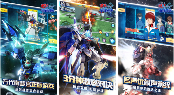 这款敢达主题的科幻风格格斗游戏战斗场景很激烈,仅需几分钟就能让高达战士分出胜负,每位高达还原度都很高而且看上去金属感十足,音效金铁交加还加入了著名日本声优配音,超酷的高达机体模型让手办爱好者流连忘返,各类激光武器和钢铁防御道具琳琅满目,一起在机动战士的神奇世界尽情战斗吧。