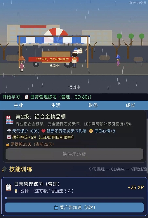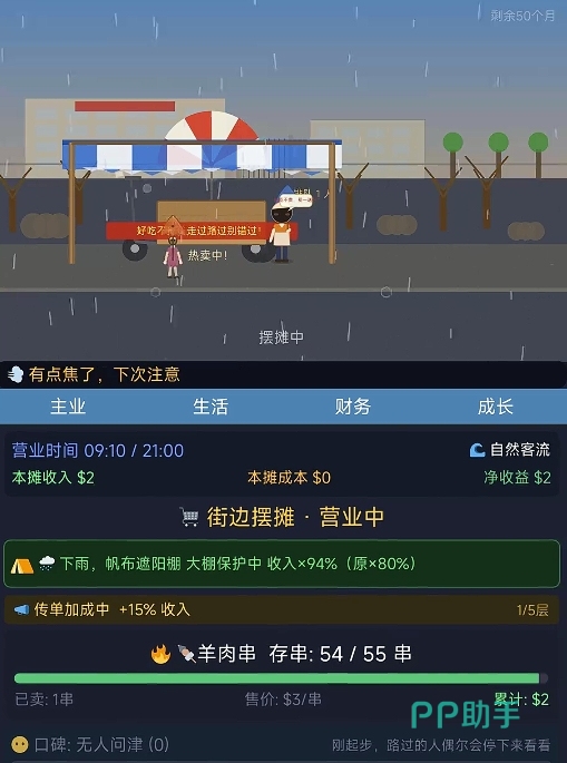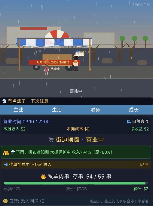 成本管控是贯穿始终的核心挑战。采购单价、炭火消耗、调料配比、员工雇佣(后期开放)等均计入日结成本表。玩家需权衡短期回本与长期投入——比如是否贷款升级烤架以提升出品效率,或暂缓技能升级转而储备应急资金抵御突发雨天损失。这种资源分配的博弈感,让每一次点击都具备策略分量,还原小微创业者的真实决策逻辑。