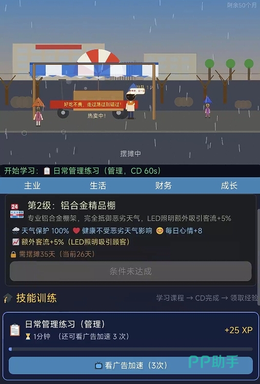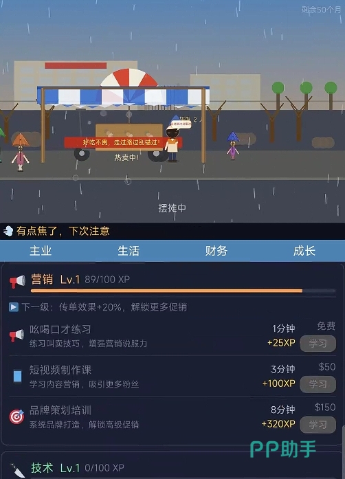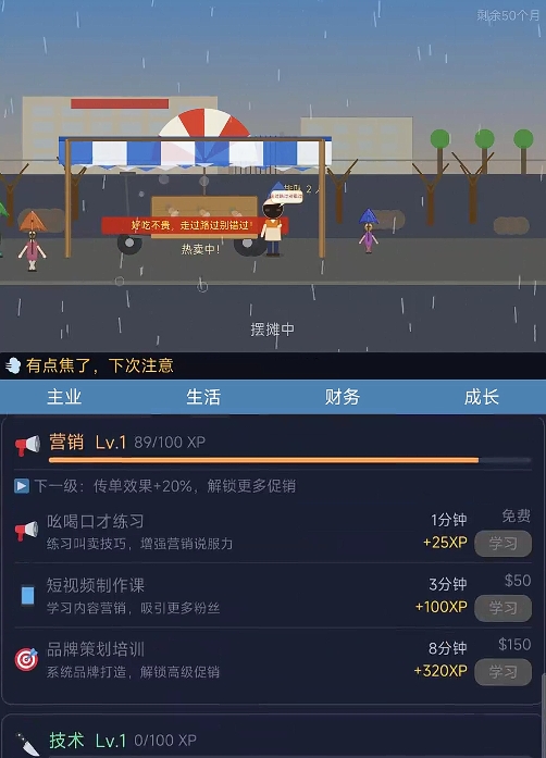 提升营收的关键不仅在于稳定出摊,更在于精细化运营决策。例如:通过技能树系统升级“沟通能力”,可提高顾客复购率与小费概率;依据地图热力图选择高人流点位布摊;研发新串品(如辣味鸡翅、蒜香五花肉)匹配不同客群口味偏好;动态调整售价与套餐组合以应对竞争摊位冲击。所有行为均影响当日收益曲线与长期口碑积累。