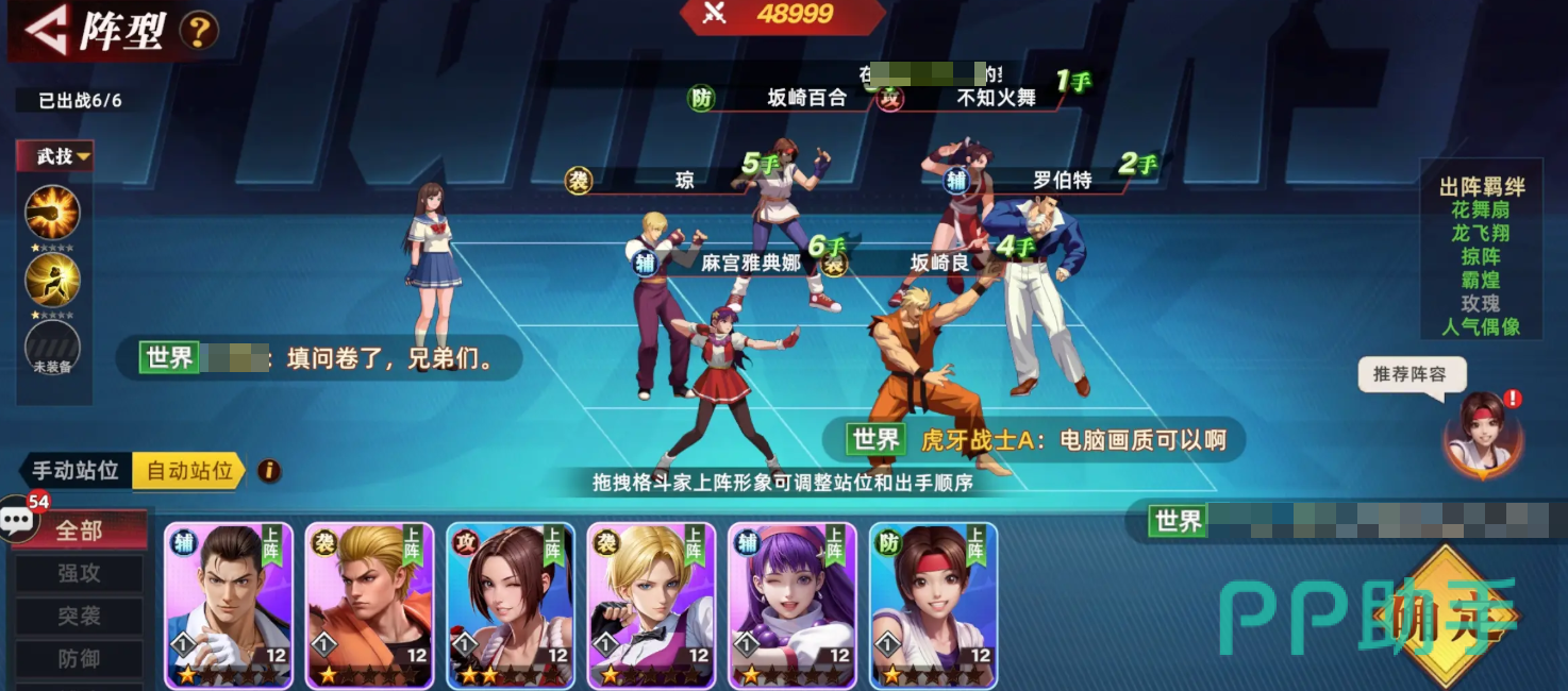 游戏以多角色自由搭配为核心玩法,玩家可以收集如草薙京、不知火舞等SNK经典人物,并根据技能特性构建阵容。不同角色之间具备控制、爆发、治疗与增益等多种职能,技能联动丰富,策略深度高,考验玩家对阵容协同的理解与运用。