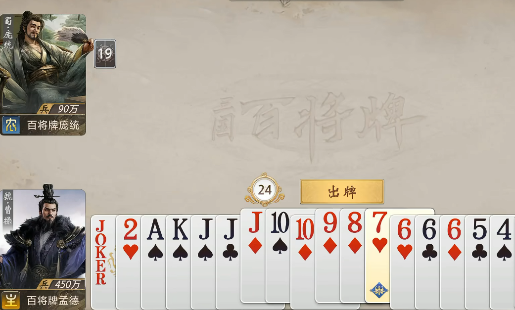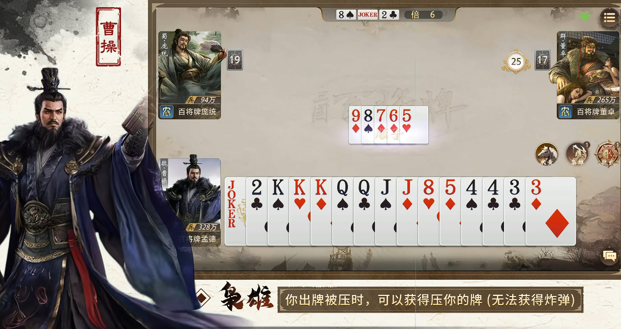 曹操的核心能力由【魏武】与【枭雄】构成:【魏武】允许玩家将任意一张点数≥5的手牌减去2点数值,该效果可重复触发,显著提升手牌组合自由度——无论是三带一、连对、顺子还是飞机带翅膀等中阶牌型,均可通过点数调整高效成型;唯独无法优化炸弹结构。这一机制从根本上缓解了“卡手”困境,使出牌节奏更可控、更主动。