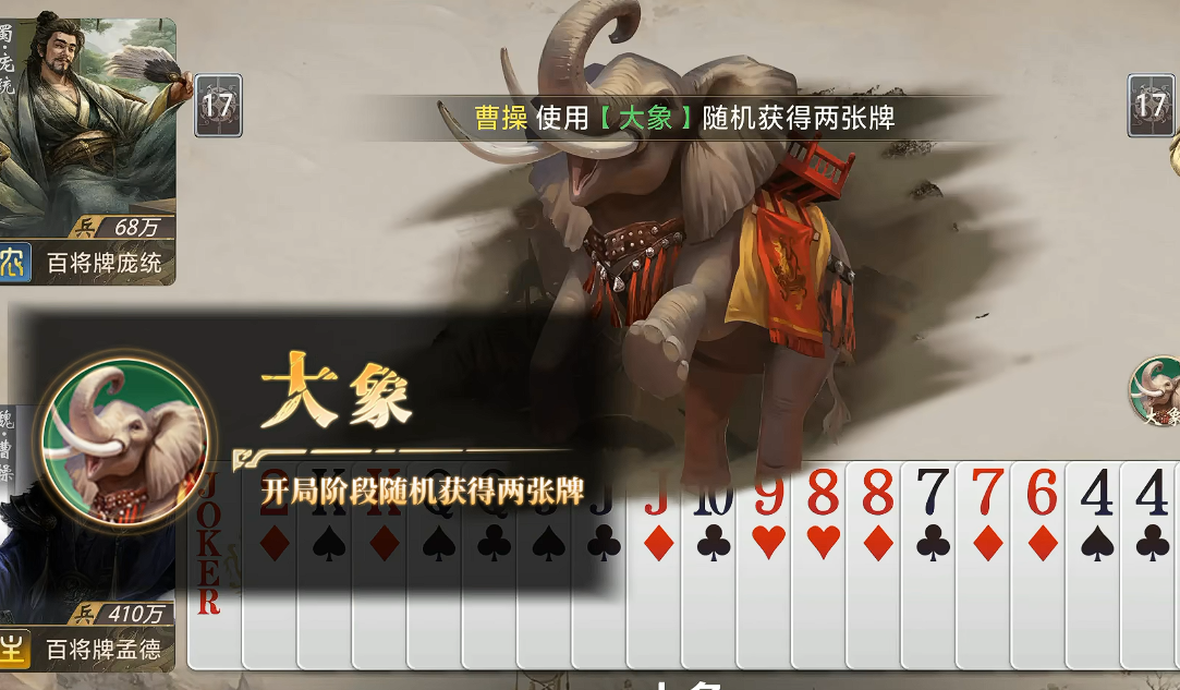 此外,坐骑系统亦是曹操体系的重要延伸。推荐选用【大象】坐骑——其效果为每回合随机抽取两张新牌。该效果极大扩充了曹操的手牌池,使其【魏武】的调牌空间更宽裕、【枭雄】的资源转化频次更高,从而在中后期形成持续性回合压制,逐步瓦解对手防御体系。