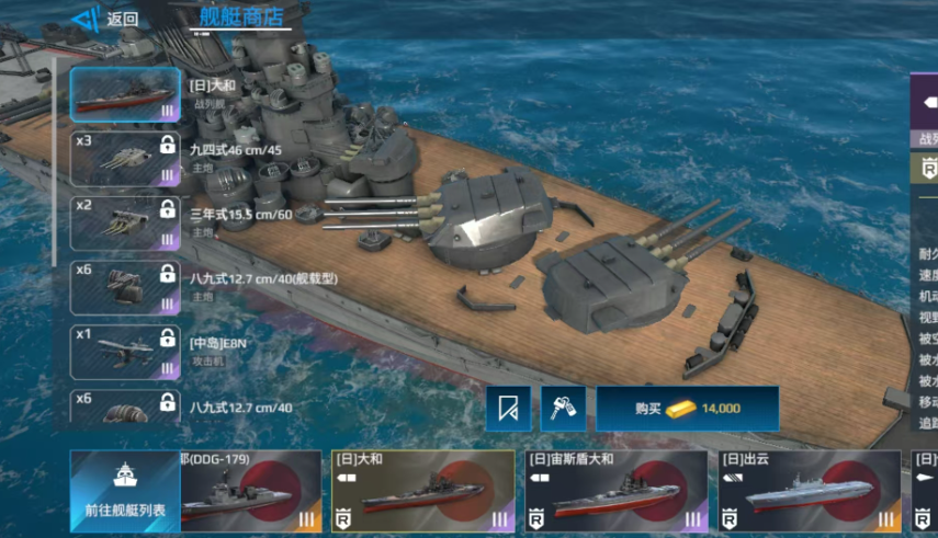 最后一个推荐的战舰叫做大和号。这艘战舰获取十分容易,玩家们直接攒够14,000金币,然后前往商店中购买就可以了,虽然说它的武器是不能更改的,但是由于每一种武器都是紫色品质,因此总的来说战斗力其实也名列前茅,在战斗时面对普通战舰,基本上一炮就能够把对方带走。