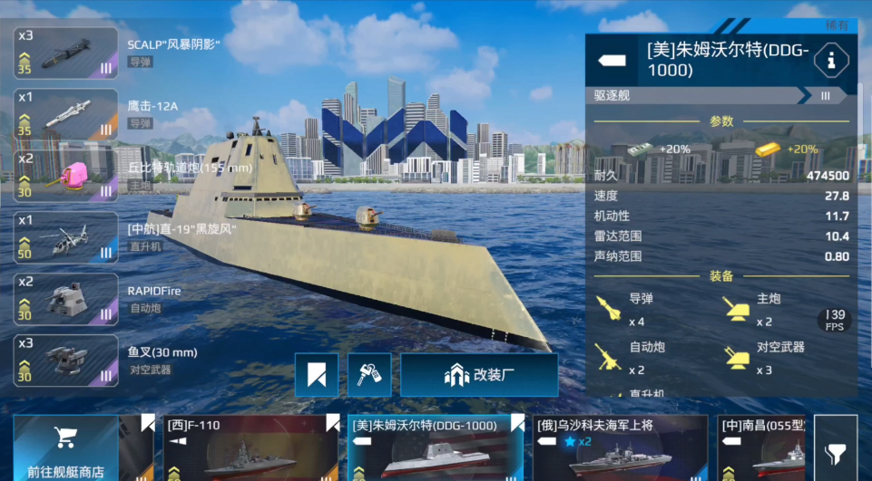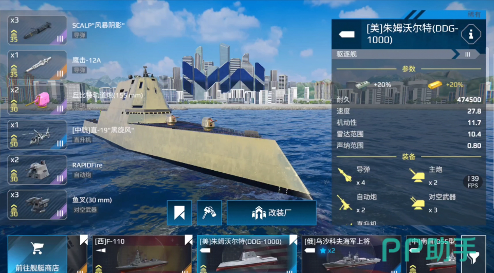 小编第1个给大家推荐的战舰是朱姆沃尔特。这艘战舰最大的优点就是侦察力和反载力都非常的强,机动性达到了27.8,雷达范围则是达到了10.4。因此小伙伴们在战斗时,可以利用它出色的移动能力,和通过雷达所收集到的信息,打敌人一个措手不及。在装备这方面也算是比较全面,主炮、自动炮、对空武器和导弹都配置到了,不过也不能看出,在反潜这方面会有些薄弱。