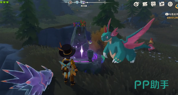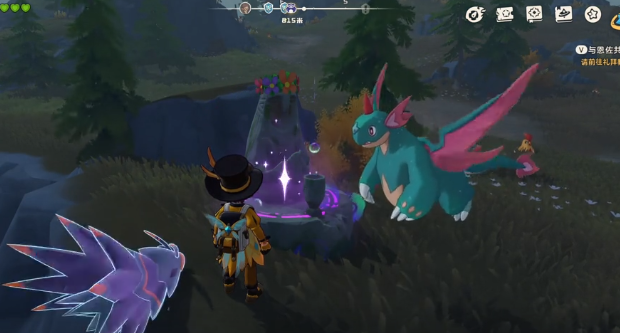 要想获取玩家就应该携带水系精灵,然后来到晨惜山。在这里就能看到一座比较神秘的雕像,玩家将水系精灵放在雕像的位置,雕像就会改变颜色,这就意味着触发成功。马上在周围的山头就能看到,当然在这里还有机会遇到一只黑化的蹦蹦鸡。