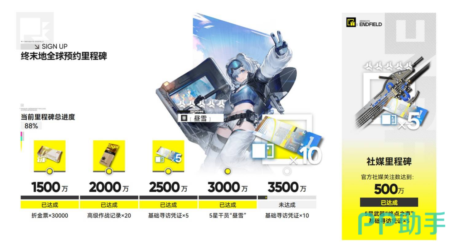 预约人数达2500万,将解锁5张基础寻访凭证,为初始卡池提供稳定抽卡机会;而关键节点3000万人达成后,全服玩家将免费获赠五星干员「昼雪」——该角色具备突出的控场与持续输出能力,可直接投入主线及高难关卡,对零氪与轻度付费玩家尤为友好,大幅降低初期资源压力。