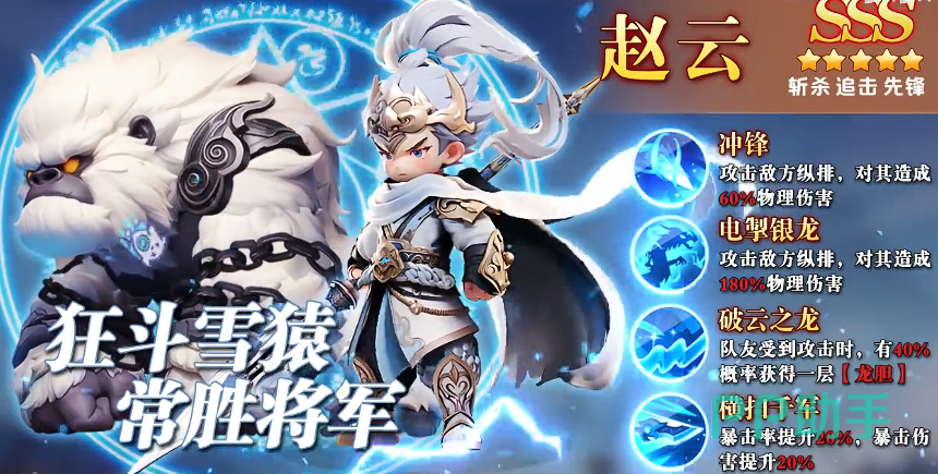 赵云位列第四,是兼具机动性与持续输出的优质多动型武将。其“龙胆”状态可通过被动叠加,每层提升行动效率与暴击强度。在达成多动条件后,可复现类似“七进七出”的高频行动链,尤其擅长纵向穿透打击,对列式站位敌人压制效果明显。随着星级提升与装备强化,暴击率与暴击伤害同步增长,后期上限可观。