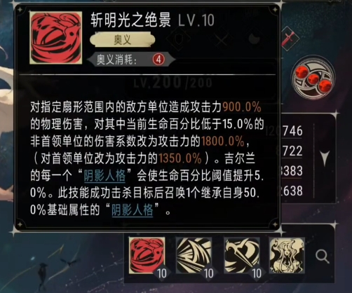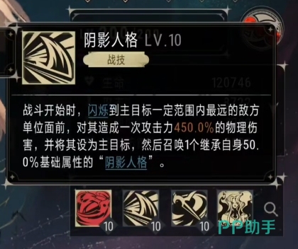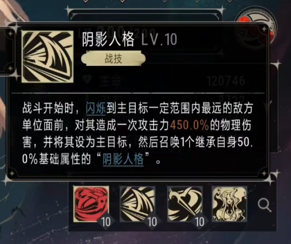 魔兰的战技效果同样是不错的,在战斗的一开始使用这个技能的时候,她会精准地选择主目标三米范围内最远的一个敌方单位作为生效目标,后续在战斗中,当魔兰第1次接近主目标后,她便会原地召唤出阴影人格,这个阴影人格并非寻常之物,它拥有魔兰50%的属性,且持续12秒钟之久,更为惊人的是阴影人格并不需要玩家操控,它会自动寻找距离最近的目标进行基本攻击。