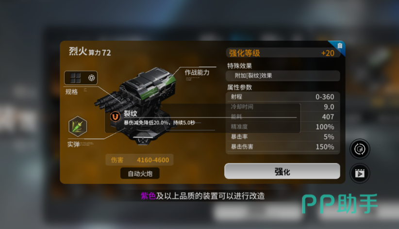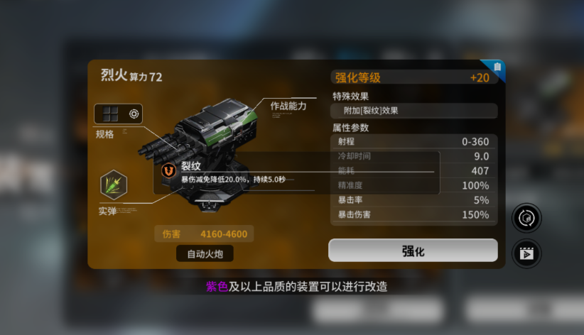 射弹类武器呈现功能分化趋势:【烈火(火神炮)】是当前版本唯一具备主动DEBUFF能力的射弹装备,可削减目标最大生命值,为团队创造安全输出窗口,低格数配置亦能发挥战术干扰价值;【打击者(迫击炮)】则专精于高护甲单位压制,面对重甲目标时伤害衰减率低,稳定性优于同类竞品,在当前射弹选项有限的前提下,仍是反甲体系中的可靠支点。