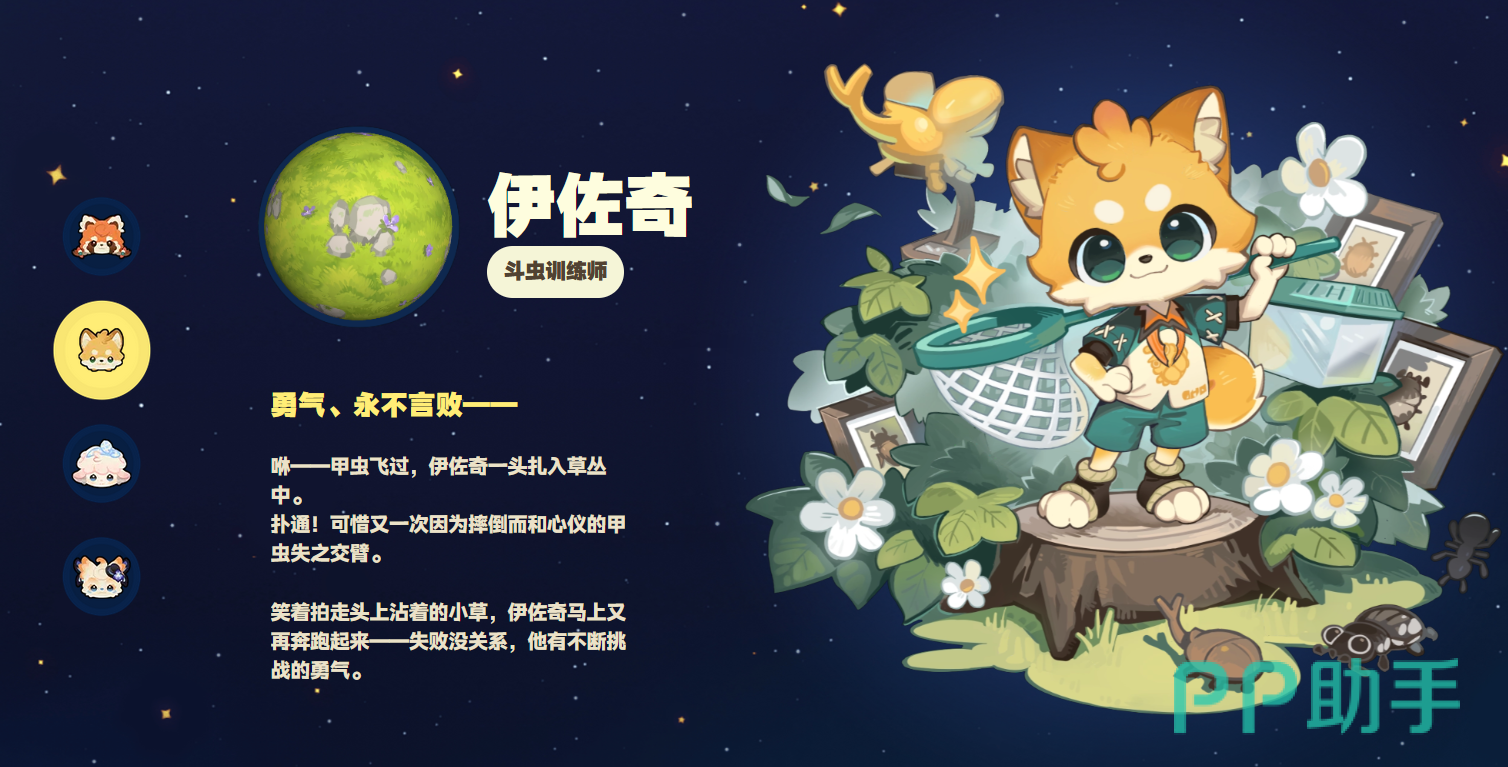 第二位角色名为伊佐奇,他的身份是一名斗虫训练师,外观采用浅黄色狐狸形象为基础,身穿轻便的绿色运动套装,手持捕虫网,展现出十足的活力感。他性格开朗外向,对捕捉稀有昆虫有着极大的热情,总是积极投入野外探索任务,是团队中不可或缺的冒险担当。