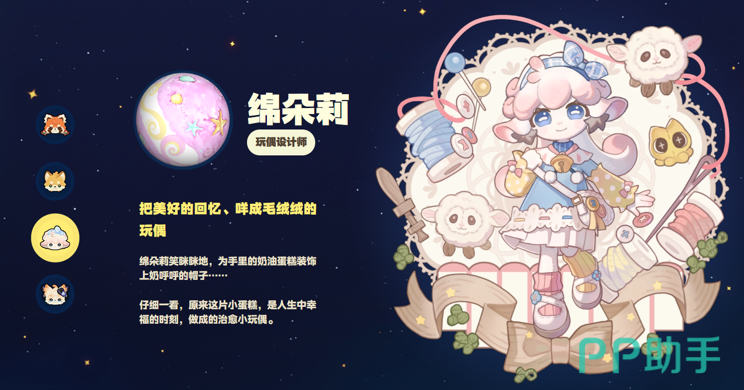 第三位角色是棉朵莉,她的职业设定为玩偶设计师,形象来源于粉色小羊,整体风格温柔可亲。她擅长通过手工制作毛绒玩具来记录生活中的点滴回忆,心思细腻,富有创造力,是星球上最具艺术气息的角色之一。