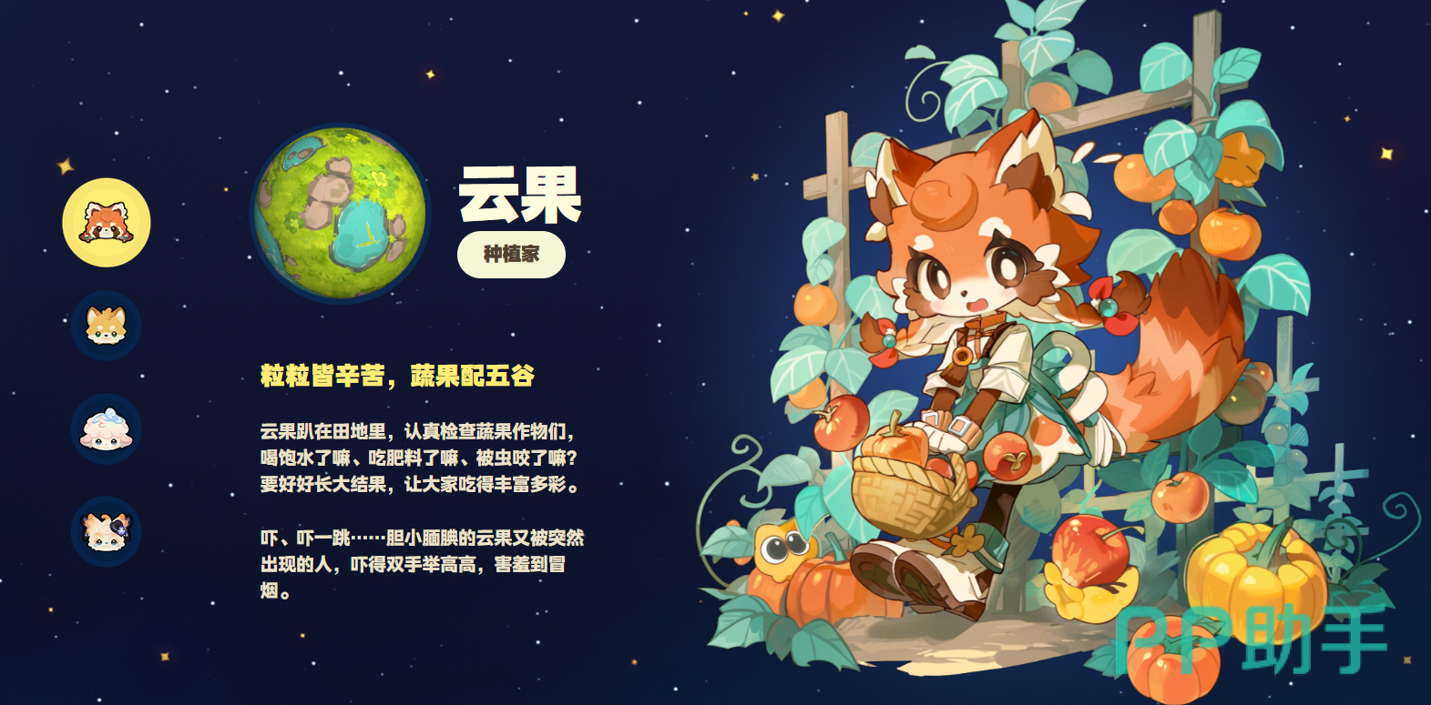 目前已确认登场的四位主要角色分别为云果、伊佐奇、棉朵莉和幻雪。他们不仅外形设计充满童趣,且各自具备鲜明的职业背景与个性特征。首先是云果,她是一位专注于种植的女性角色,以橙色狐狸为原型进行拟人化创作,整体造型活泼又不失灵动。性格偏向安静腼腆,常常沉浸在田间地头,仔细观察果树的生长状态,是星球农业发展的核心人物之一。