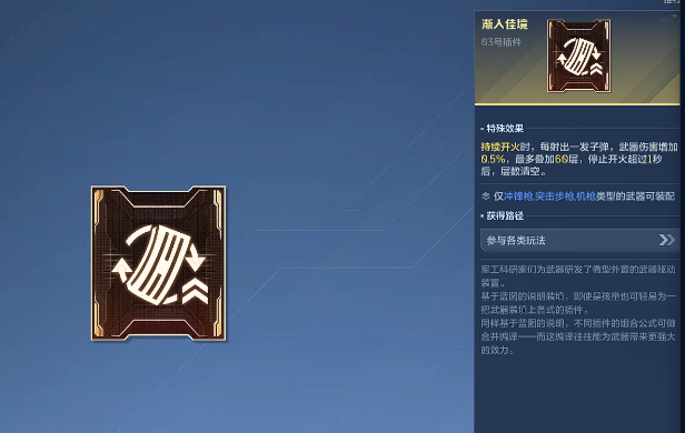 仅依赖武器基础属性难以应对复杂战局,因此合理搭配插件至关重要。若希望进一步延长火力持续时间,建议装配过载弹夹,此配件可显著增加弹匣容量,尽管会略微降低换弹速度,但其带来的续航优势足以弥补这一短板,适用于所有类型枪械,灵活性极高。另一个强力选项是渐入佳境,专用于冲锋枪、突击步枪及机枪类武器,每次开火均可叠加额外伤害,最高可达60层,适合长时间交火环境中逐步建立输出优势。