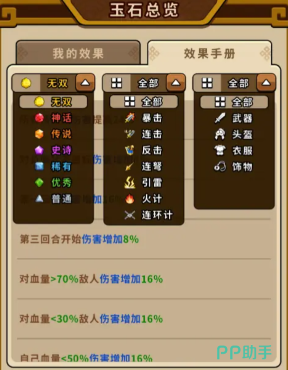 玉石在游戏当中的核心作用,是镶嵌在四大部位的装备上,例如武器、头盔、衣服、饰品,它可以分别为玩家提供,攻击数值加成、暴击伤害增幅、生命数值提升,同时,还有计策型的玉石可供玩家选择,这10种不同类型的专属增益效果,可以根据角色的情况,进行合理搭配。