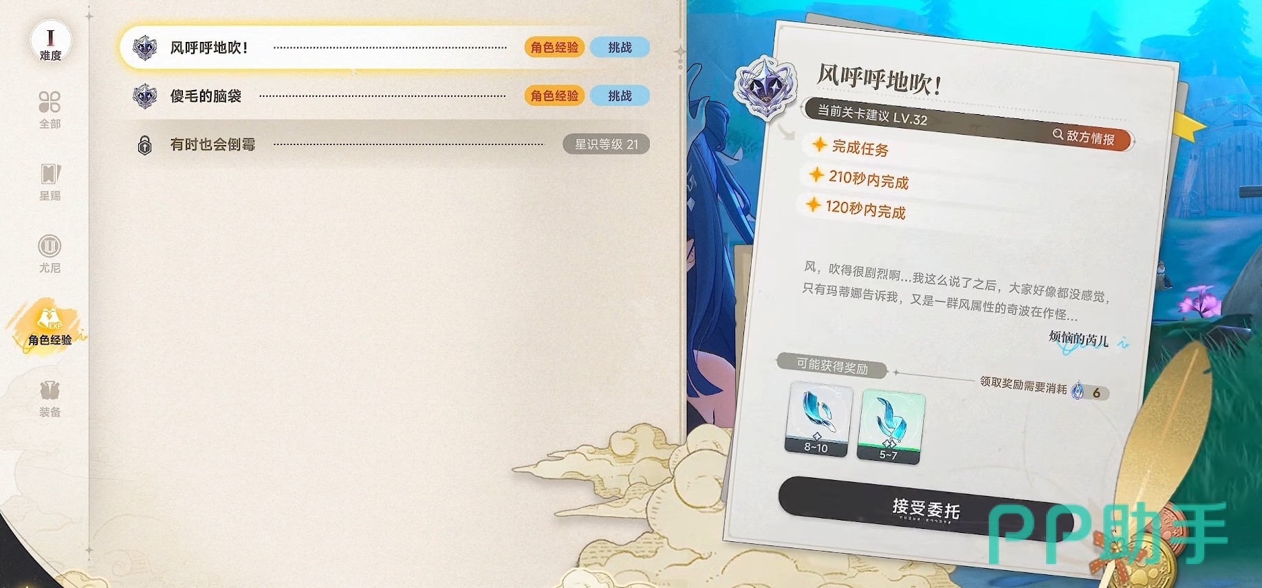 【风呼呼地吹!】委托对角色练度有一定要求,官方建议挑战前将主力角色等级提升至32级。该任务共设三项星级判定标准:一为完成全部流程;二为在210秒内通关;三为在120秒内通关。需特别注意——满足第三项即自动覆盖前两项,因此高效压秒是冲击满星的核心目标。