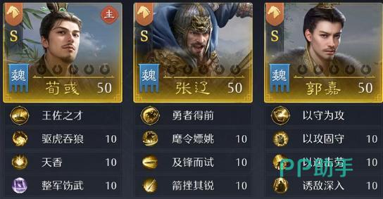 技能配置方面,荀彧主战技组合为:王佐之才、驱虎吞狼、天香、整军饬武,突出谋略输出与群体增益;张辽采用勇者得前、麾令嫖姚、及锋而试、箭挫其锐,强化突击频率与单体压制;郭嘉则搭配以守为攻、以攻固守、以逸击劳、诱敌深入,构建攻防一体的战术循环。四技能均严格遵循武将定位与兵种特性,无冗余或错配。