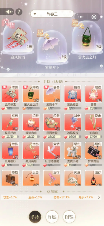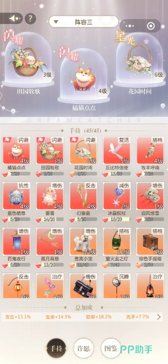 再来介绍第二套套装,是大梦小姐。这套服装可以完成闪避提升,而且第二种思路主要是以堆砌闪避方法为主,不仅可以提升玩家的自身长时间战斗模式,而且在闪避的同时可触发主位搭档的技能,所以整体伤害值特别高,推荐玩家去携带一些带有高闪避率的手持,如田园牧歌,橘猫点点,花园时光这三个是非常推荐的。