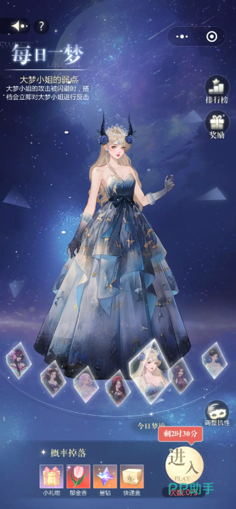 第一套服饰推荐美梦公主。玩家可以携带暴击搭档和奶妈搭档,在守时方面可以选择迎风惊雪,紫荆伞下,萤火虫之灯这三个手持,能够保证在有限的回合之内打出伤害,在后期的话,如果玩家的手持以及搭档等级较高,那么可以不带奶妈,直接换上输出型选手。大概投入1700万入梦能力可以打出2125万伤害,不过该种模式的话仅供参考。