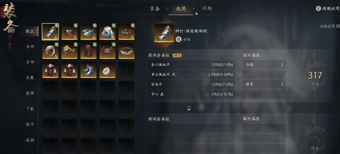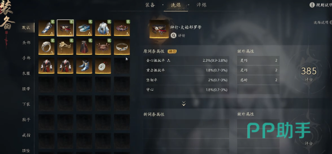 「太始都罗带」初始含会心抵抗率、重击抵抗率、整韧率、会心,攻防兼备,具备高度词条可塑性。对输出职业而言,建议主动剥离防御向词条(如气血、抗性类),集中资源置换为暴击伤害与精准率;原词条中的“会心”可予以保留,构成稳定暴击链基础;额外属性“忍耐”亦建议保留,兼顾生存与输出节奏,在高强度副本或PVP环境中提供更优表现空间。