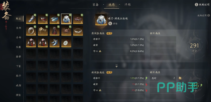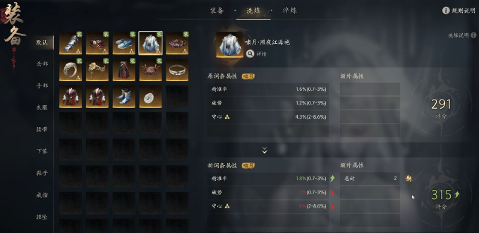 「黑夜江海袍」初始词条含精准率、破势、会心,属典型高爆发输出装。其中精准率直接决定技能命中阈值,是洗练首要目标——务必优先洗至该部位词条上限值。其余词条可围绕输出闭环优化:破势提升破防效率,会心增强爆发频率;额外属性中,“忍耐”对半肉输出及纯输出职业均有显著加成,有助于维持战斗容错并拉高极限伤害输出。
